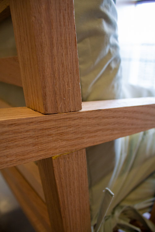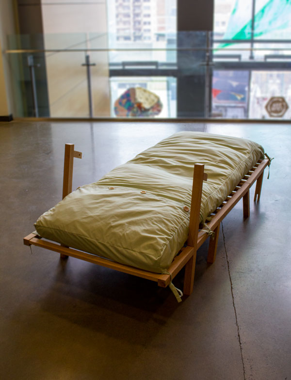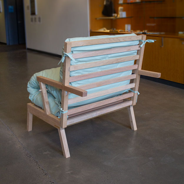 The futon cover, secured closed by buttons, is attached to the chair with simple ties for ease of washing and transportation. The whole body of the piece is made out of oak and joined together by piano hinges. Only a few tools are needed to disassemble it and get it ready for its next destination.
